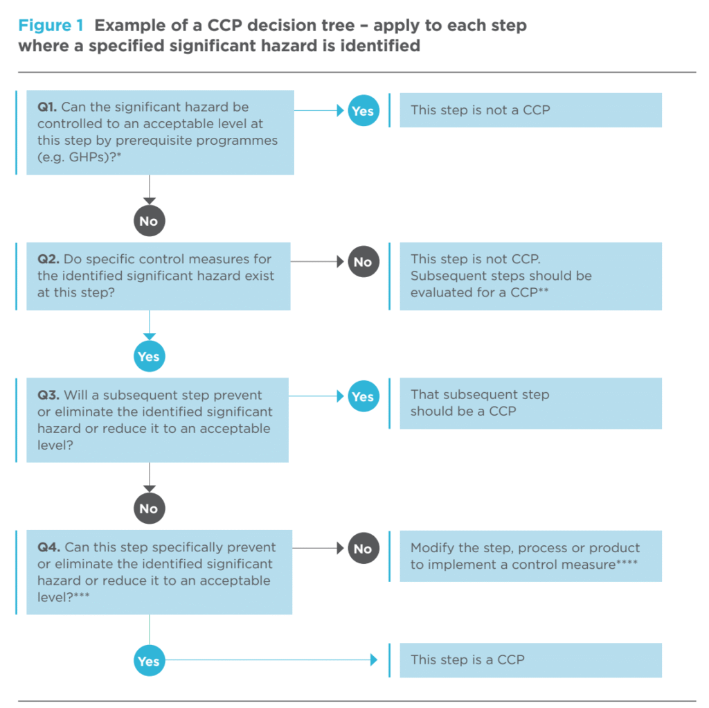 Bahaya dengan risiko rendah dikelola melalui PRP, sedangkan bahaya signifikan dianalisis lebih lanjut menggunakan decision tree HACCP (Codex Alimentarius) untuk menentukan apakah kontrol tersebut OPRP atau CCP.